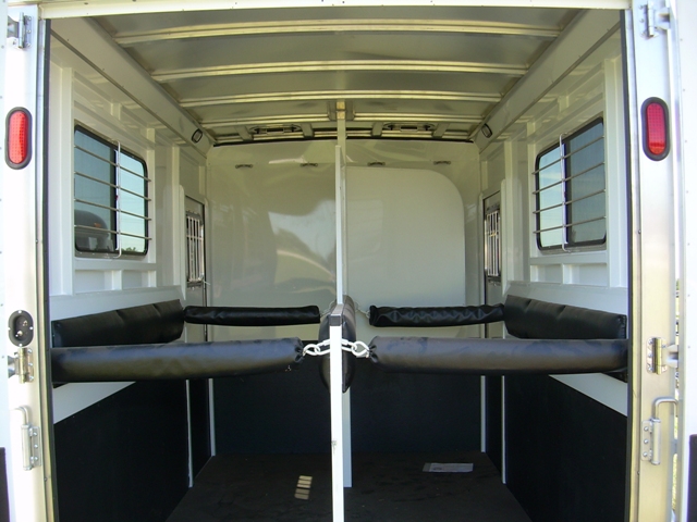 White with black trim 2-3500 axles Escape door in front stall-all steel frame- electric brakes-rubber mats in horse area-tie rings inside and out- pop-up roof vents-inside lights-spare tire and wheel